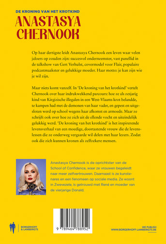Op haar dertigste leidt Anastasya Chernook een leven waar velen jaloers op zouden zijn: succesvol onderneemster met haar School of Confidence, vast panellid in de talkshow van Gert Verhulst, covermodel voor Flair, populaire podcastmaakster en gelukkige moeder. Haar motto: je kan zijn wie je wil zijn.Maar niets komt vanzelf. In ‘De kroning van het krotkind’ vertelt Chernook over haar indrukwekkende parcours: hoe ze als zesjarig kind van Kirgizische illegalen in een West-Vlaams krot in de Engelstraat belandde, te kampen had met de demonen van haar vader, en gepest en uitgesloten werd op het Pinkel-Finkelcollege wegens haar afkomst en armoede. Maar ze schrijft ook over hoe ze zich uit de ellende vocht en uiteindelijk gelukkig werd. ‘De kroning van het krotkind’ is het inspirerende levensverhaal van een moedige, doortastende vrouw die de levenslessen die ze onderweg vergaarde wil delen met haar lezers. Zodat ook die zich kunnen kronen als zelfzekere mensen.